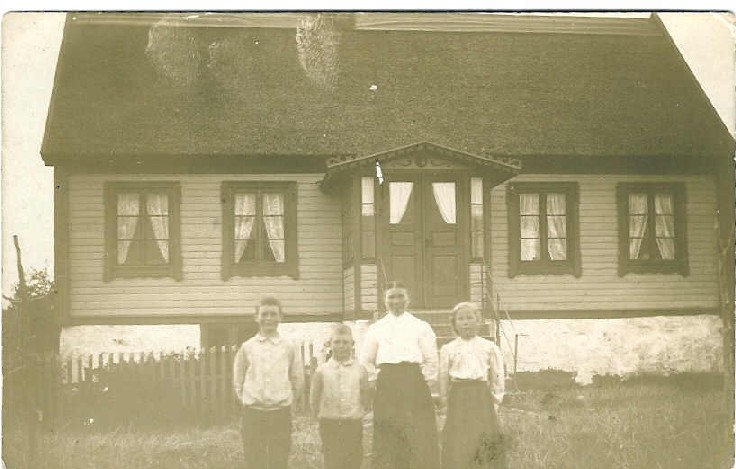 Bild: Ingri Olsson med barnen Artur, Rudolf och Hertha utanför huset ca 1905 innan det brann ner (O:31)