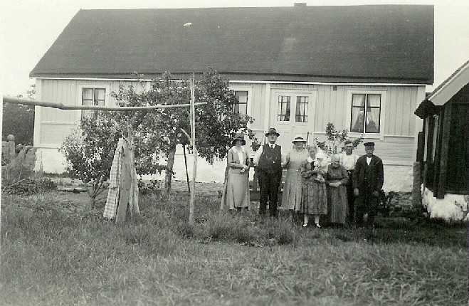 O:23 Bengt Andersson med familj Två gäster på besök, Betty med sonen Bengt-Arne på armen, Ingrid, Axel och Bengt utanför huset (O:23). Foto från ??.