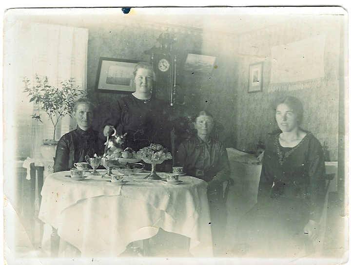 O:31 Inomhus Augusta Hellberg (O:27), Ingris fosterdotter Hertha, Ingri Olsson och Ingris sonhustru Tekla dricker kaffe inne i huset (O:31). Året är 1923. Foto från EH.