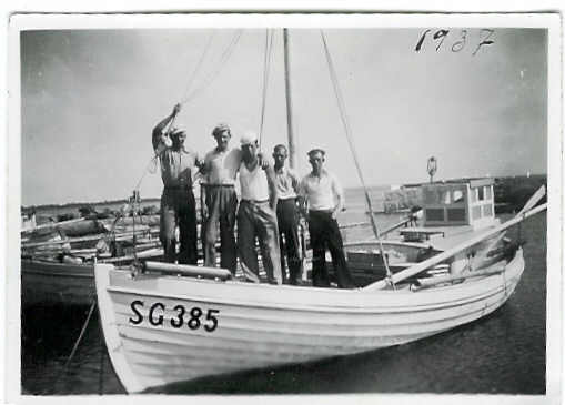 Bildtext: Ett glatt gäng fiskepöjkar från Torsö ombord i SG 385. Fr.v. Seth Lysell, Gösta Listersjö, Torsten Thörnberg, Harry (eller Bernhard) Persson och Ludvig Thörnberg. På bilden ser man tydligt det lilla hopfällbara vindskydd som omtalas i artikeln.