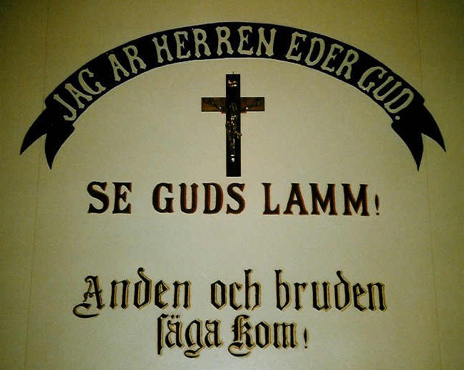 Längst fram i fonden fanns som sig bör, den praktfullaste och dekorativaste målningen. I en böljande banderoll stod målat ”Jag är Herren Eder Gud”, vidare kunde man läsa i röd relieftext : ”Se Guds Lam” och i en snirklig och fin gammaldags stil: ”Anden och bruden säga kom!”. Ja, det var tydligen lite si och så med stavningskunskaperna hos den som fått i uppdrag att måla de tänkvärda orden. Därför kom det att stå ”lam” i stället för lamm.