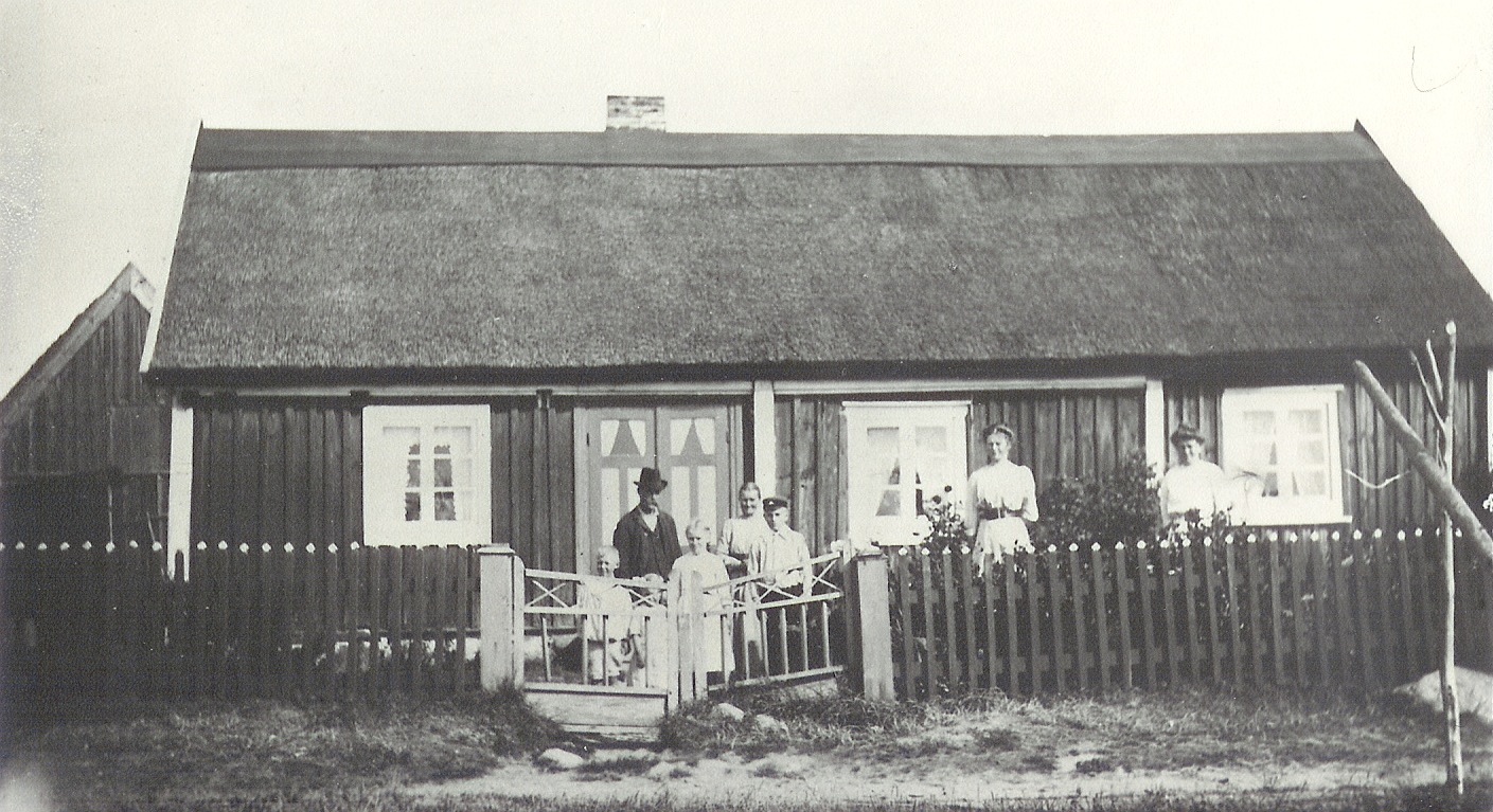 V:39 Sven Julius familj utanför huset Sven Julius med hustrun Nilla och barnen Gottfrid, Nanny, Betty och Bernhard utanför huset. (V:39). En av de unga damerna till höger är troligvis Albina. Bilden troligtvis tagen 1904 innan Bernhard reste till Amerika. Foto från EvaL.
